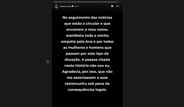 «A pessoa visada nesta história não sou eu» escreveu Nelson Évora rejeitando qualquer associação às denuncias feitas pela atleta num vídeo no Tik Tok onde revelou ter sido repetidamente vítima de abusos sexuais durante uma relação passada. «No seguimento das notícias que estão a circular e que envolvem o meu nome, manifesto toda a minha empatia pela Ana e por todas as mulheres e homens que passam por este tipo de situação. A pessoa visada nesta história não sou eu. Agradecia, por isso, que não me associassem a esse testemunho sob pena de consequências legais», pode ler-se na mensagem publicada pelo antigo triplista nas redes sociais.
