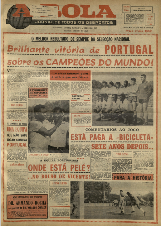 Outra antevisão em letras gordas: Pelé no «bolso» de Vicente. Sucederia o mesmo no Mundial-66, onde Portugal bateu o Brasil por 3-1, aí já a contar. De resto, o historial não é famoso: 20 jogos, 4 vitórias lusas, três empates e 13 triunfos brasileiros.