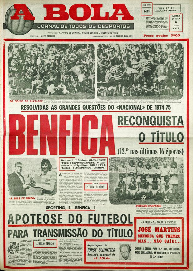 A BOLA de 5 de maio de 1975 fez manchete com o empate a um golo no Sporting-Benfica, dérbi que coroou os encarnados como campeões nacionais