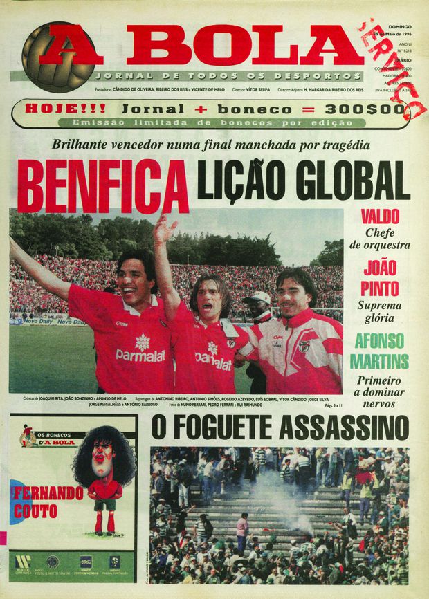 Festa e tragédia. A BOLA fazia manchete há 29 anos com a conquista do Benfica diante do rival Sporting na final da Taça de Portugal. Um jogo manchado para sempre pela morte de um adepto leonino em pleno Jamor, vítima de um very light lançado da bancada oposta e que sobrevoou todo o Estádio Nacional, atingindo-o fatalmente. 'O foguete assassino', assim classificou o nosso jornal um dos momentos mais negros do futebol português.