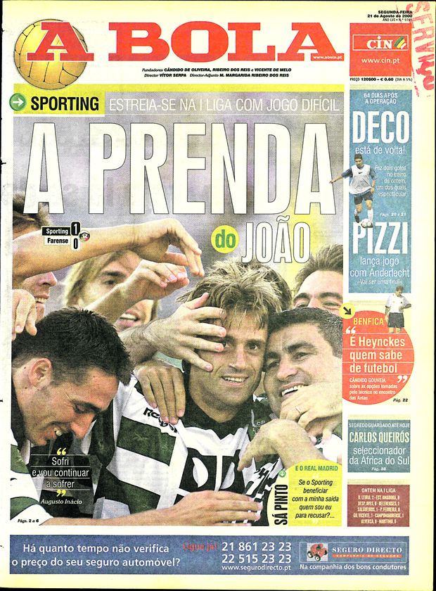 A prenda do João. Foi esta a manchete de a A BOLA de 21 de agosto de 2000, day-after à já referida estreia da equipa então orientada por Augusto Inácio.