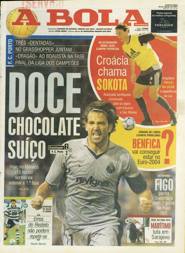 Doce chocolate suíço foi, pois, a manchete de A BOLA de 23 de agosto de 2001, alusão, lá está, à saborosa vitória dos azuis e brancos, que começou a ser construída ao minuto 14, golo de Clayton. Ainda na primeira parte, aos 43', Capucho fez o 0-2, vantagem que o emblema helvético reduziu à passagem do minuto 78, por Mladen Petric.