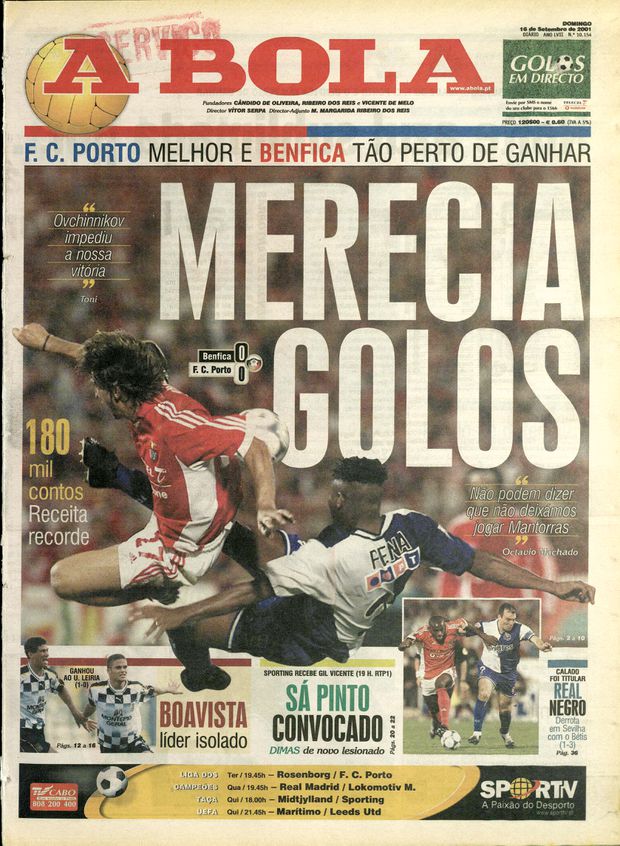 A primeira página de A BOLA de 16 de setembro deu (natural) destaque ao jogo grande da quinta jornada da Liga de 2000/01 (conquistada pelo Boavista) entre Benfica e FC Porto, clássico que, pese algumas boas oportunidades — com destaque para os remates aos ferros de Simão e Capucho —, terminou tal como começou, ou seja, com um empate a zero.