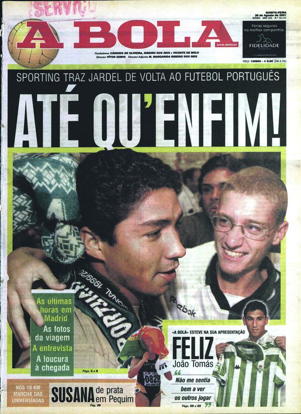'Até qu'enfim' foi a manchete de a A BOLA de 30 de agosto de 2001, day-after à chegada do goleador brasileiro a Lisboa. Com ele (e mais João Vieira Pinto, entre outros artistas), o Sporting arrancou para uma temporada. a de 2001/2002, coroada de sucesso com a conquista do Campeonato e da Taça de Portugal. Com 55 golos em 42 encontros (e 42 em 30 jogos no Campeonato), Jardel foi, pois claro, decisivo para a dobradinha dos leões, feito só repetido na última temporada.