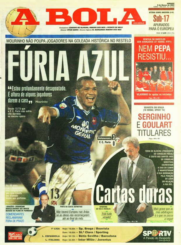 Vitória histórica do Belenenses sobre o FC Porto a fazer manchete em A BOLA. Os dragões caíram no Restelo, vergados por claro 0-3, momento para José Mourinho marcar posição: «Estou profundamente desapontado. É altura de alguns jogadores darem a cara.»