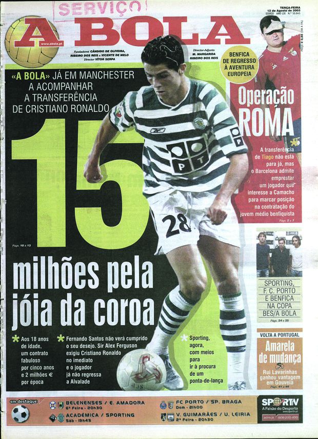 E assim, menos de uma semana depois, já CR7 (e A BOLA, claro), estava em Manchester para assinar pelos diabos vermelhos. E foi mesmo a 12 de agosto que o fez, negócio que, na altura, fez entrar 12 milhões de libras — sensivelmente 15 milhões de euros — nos cofres leoninos. Vinte e dois anos depois, todos conhecem o trajeto do maior embaixador do país...