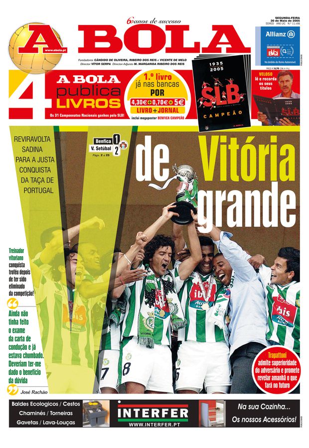 O Vitória de novo a ser grande. Depois dos inesquecíveis feitos dos anos 60, os sadinos festejaram no Estádio Nacional. A BOLA deu o merecido destaque à conquista da Taça de Portugal pelo Vitória, que surpreendeu um Benfica acabadinho de ser campeão.