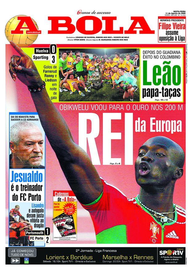 O Rei da Europa. Esta foi a manchete de A BOLA de 11 de agosto de 2006 a propósito da conquista de Francis Obikwelu, velocista português nascido em Onitsha, Nigéria, a 22 de novembro de 1978 (tem, pois, 46 anos), da medalha de ouro nos 200 metros nos Campeonatos da Europa de Atletismo.