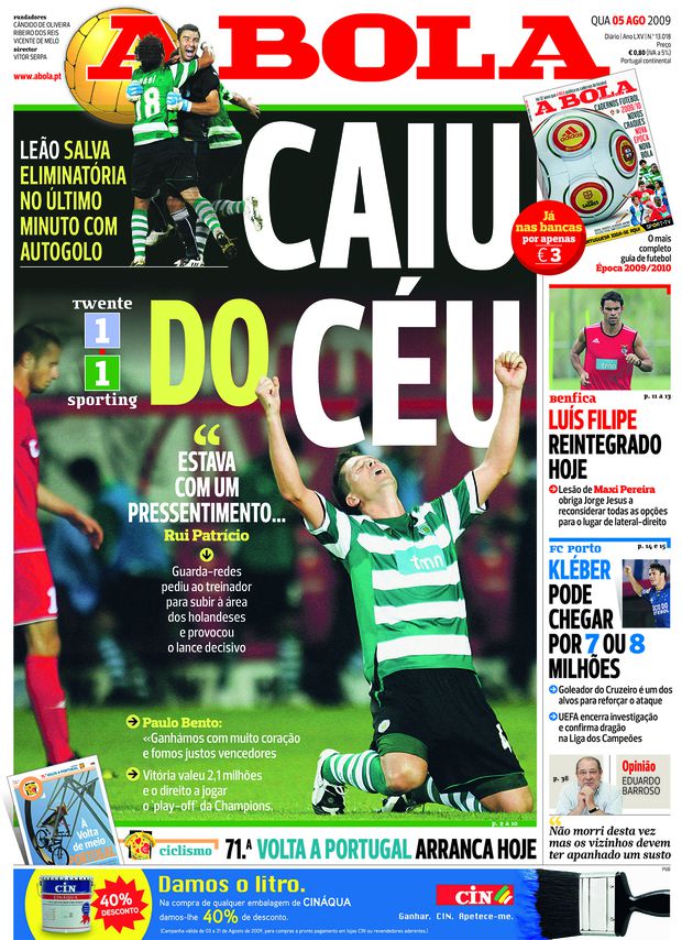 E, como diz a primeira página de A BOLA de 5 de junho, «caiu do céu» o empate e um golo. Logo ao minuto 2, Douglas inaugurou o marcador e a felicidade leonina surgiu ao cair do pano, golo na própria baliza de Wisgerhof aos 90+5', lance de bola parada no qual o guarda-redes Rui Patrício foi à área adversária. «Estava com um pressentimento», admitiu o keeper.