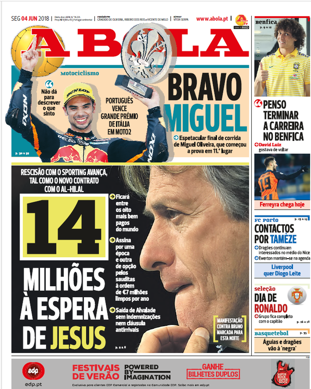 A toda a velocidade, Miguel Oliveira festejava a vitória no Grande Prémio de Itália de Moto 2, a justificar um «Bravo» no rodatopo da primeira página de 4 de junho de 2018. Afinal, iniciara a corrida na 11.ª posição e no fim das contas olhava para a frente e não via ninguém.