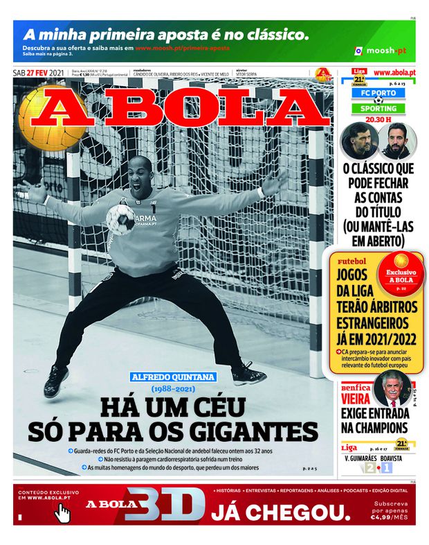 A 22 de fevereiro de 2021, o FC Porto comunicou, a meio da tarde, a notícia que corria, sem confirmação oficial, de que Alfredo Quintana estaria em estado grave, após colapsar no treino da manhã da equipa de andebol do FC Porto. A mensagem, sem grandes detalhes, não augurava nada de bom. Em todo o lado, ouvia-se que a situação era grave, o silêncio em volta do assunto adensava a angústia.