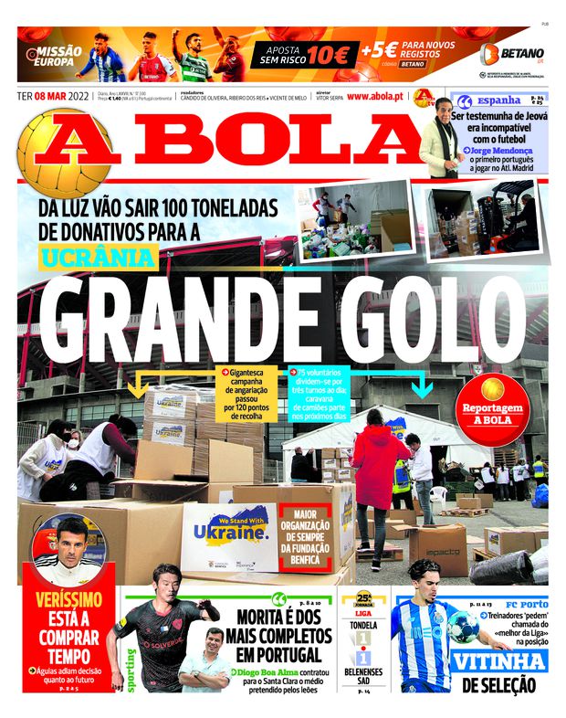 Em Fevereiro de 2022 as tropas russas começaram a invadir a Ucrânia e a 8 de março, dia internacional da mulher (não são todos os dias?), a A BOLA fez manchete com um golo, ou melhor, golaço, que o Benfica (por intermédio da sua fundação) marcou fora de campo: a angariação de 100 toneladas de donativos para o povo ucraniano.