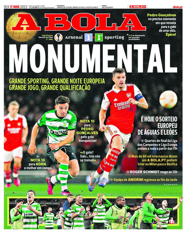 Noite memorável do Sporting na casa do Arsenal, que eliminou os ingleses, em Londres, nos oitavos de final da Uefa Europa League, no desempate por penáltis (5-3). A BOLA fez manchete a 17 de março com a brilhante qualificação dos leões na véspera e o inesquecível golo de Pedro Gonçalvesa merecer destaque especial. Um remate monumental à saída do meio-campo do internacional português, que surpreendeu Ramsdale.