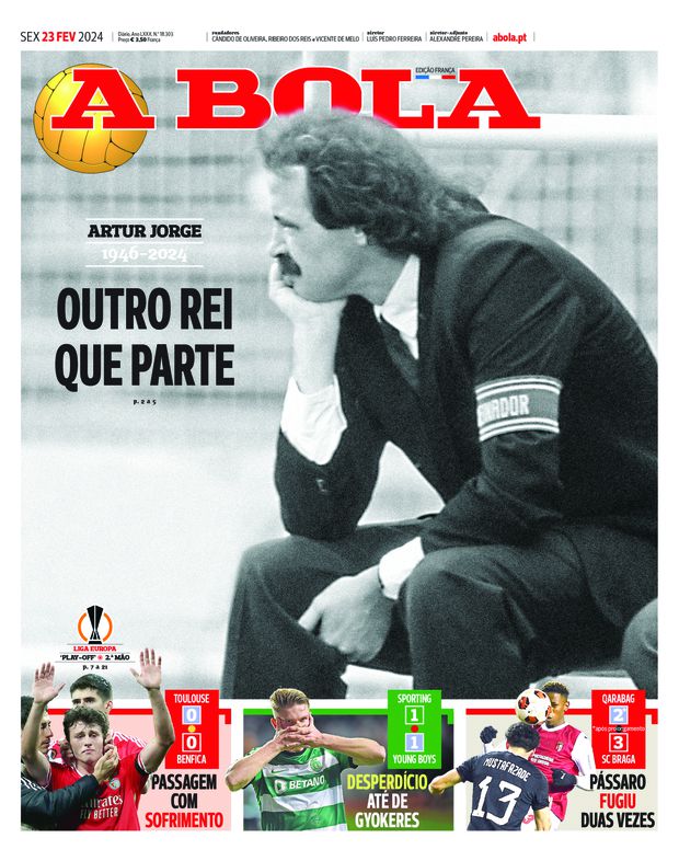 A BOLA de 23 de fevereiro de 2024, há um ano, portanto, fez manchete com a morte de Artur Jorge, que na véspera, 22 de fevereiro, falecera aos 78 anos. Natural do Porto, onde nasceu a 13 de fevereiro de 1946, Artur Jorge Braga de Melo Teixeira vestiu as camisolas de FC Porto, Académica, Benfica (clube ao serviço do qual foi quatro vezes campeão nacional) e Belenenses. Dezasseis vezes internacional por Portugal (com um golo marcado), Artur Jorge, depois de pendurar as chuteiras (em 1978), vestiu a pele de treinador e passou por vários clubes, entre os quais FC Porto (por duas vezes, de 1984 a 1987 e de 1989 a 1991, sendo que na primeira passagem venceu a então Taça dos Clubes Campeões Europeus, 2-1 na final de Viena ao Bayern, e foi três vezes campeão nacional), Benfica, Belenenses, V. Guimarães, Matra Racing, PSG, Al Nassr, Al Hilal, Académica e CSKA Moscovo. Orientou ainda as seleções de Portugal, Suíça e Camarões.