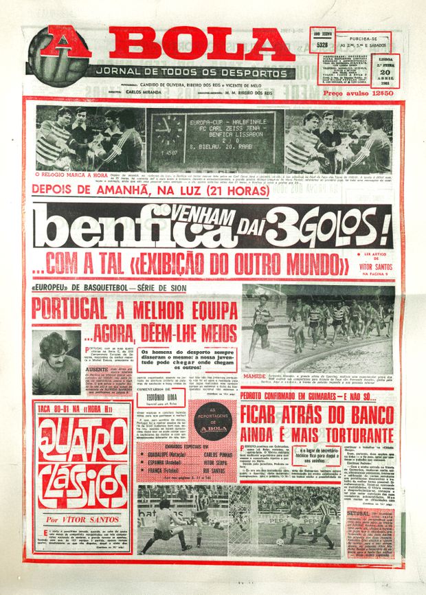 A primeira página de A BOLA de 20 de abril de 1981 apelava a uma «exibição do outro mundo» do Benfica dois dias depois, a 22 de abril, na receção aos alemães (então de leste) do Carl Zeiss Jena, encontro da segunda mão das meias-finais da já extinta Taça dos Vencedores das Taças.