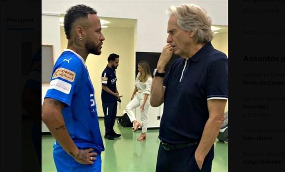 Neymar está a ser apresentado com pompa e circunstância na tarde deste sábado como a nova estrela do Al Hilal de Jorge Jesus mas antes da enorme festa que decorreu no estádio o que mais chamou a atenção foi o encontro entre o astro brasileiro e o treinador português, retratado na imagem publicada e que já viralizou nas redes sociais, sobretudo no Brasil, onde foi amplamente reproduzida.