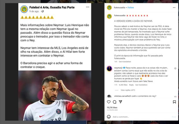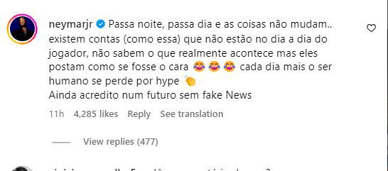 Neymar negou. «Passa noite, passa dia e as coisas não mudam... existem contas (como essa) que não estão no dia a dia do jogador, não sabem o que realmente acontece, mas eles postam como se fosse o cara. Cada dia mais o ser humano se perde por hype. Ainda acredito num futuro sem fake news», comentou Neymar.