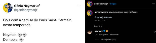 Neymar está novamente no centro da polémica, desta feita por gozar com o rendimento de Ousmane Dembélé em Paris. Uma página no Instagram comparou os números do brasileiro com os do francês no PSG e o atual jogador do Al Hilal reagiu com um emoji a rir.