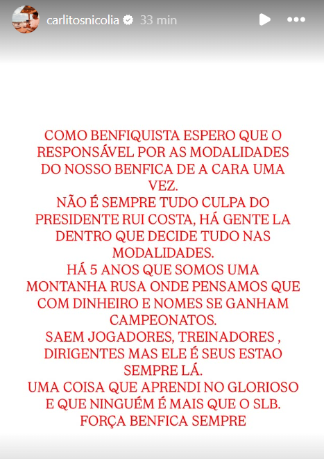 «Como benfiquista, espero que o responsável das modalidades do nosso Benfica dê a cara de uma vez. Não é sempre tudo culpa do presidente, Rui Costa. Há gente lá dentro que decide tudo nas modalidades. Há cinco anos que somos uma montanha-russa, onde pensamos que com dinheiro e nomes se ganham campeonatos. Saem jogadores, treinadores e dirigentes, mas ele e os seus estão sempre lá. Uma coisa que aprendi no Glorioso é que ninguém é mais do que o SLB. Força, Benfica, sempre», lê-se na publicação do antigo jogador no Instagram.