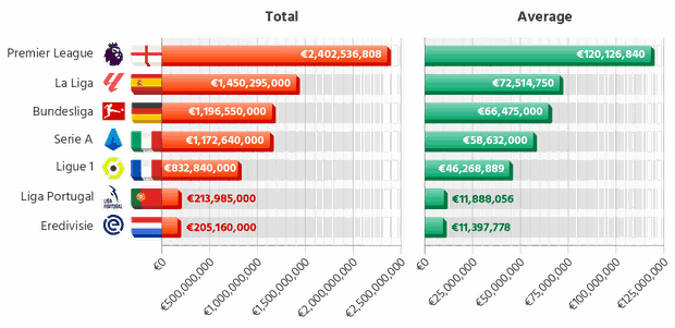 Já no que concerne à comparação entre ligas, é evidente o gigante poderio financeiro da Premier League, na qual, ao todo, se gasta mais de 2,4 mil milhões de euros apenas nesta época. A Liga está ligeiramente acima da Eredivisie, campeonato neerlandês.