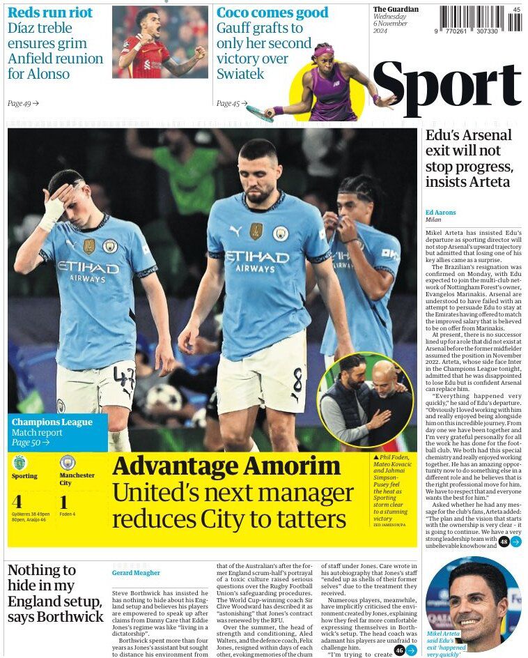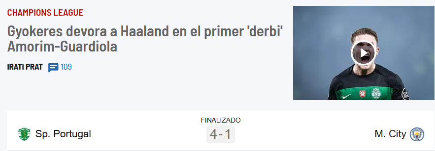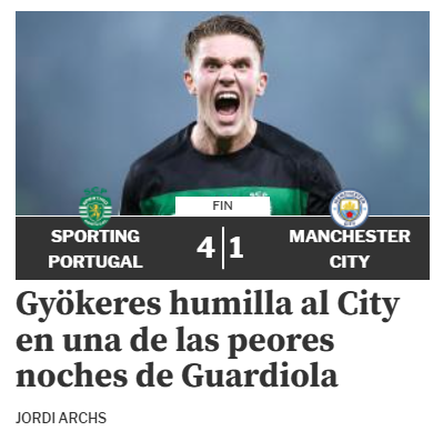 «Gyokeres humilha o City numa das piores noites de Guardiola», escreve o Mundo Deportivo, enquanto em França, a RMC Sport atira: «Presente de despedida de Amorim embrulhado por Gyokeres.»