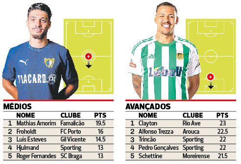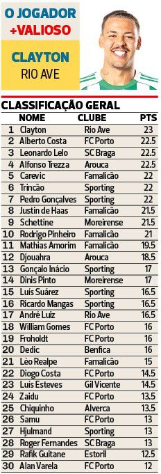Com um jogo em atraso (deslocação à Luz referente à ronda inaugural, agendado para 23 deste mês), ainda não houve partida nesta temporada sem Clayton fazer o gosto ao pé (1+2+2 golos) e apesar de o seu Rio Ave só ter empatado na prova, o dianteiro brasileiro assumiu a liderança da classificação de O jogador mais valioso de A BOLA da Liga ao participar nos seis golos vilacondenses: marcou cinco de pé direito (um de pénalti) e fez a assistência para o outro. Vai bem lançado para pulverizar os 14 golos apontados nos 31 jogos do campeonato anterior.