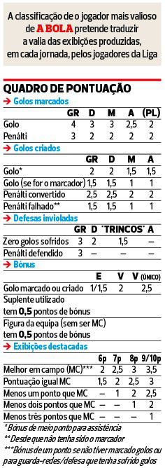 O cimo da tabela passou a estar totalmente congestionado, pois encontramos 10 jogadores separados tão-só por dois pontos! O pódio é agora ocupado por dois laterais muito ofensivos, Alberto Costa (2.º) e Leonardo Lelo (3.º), o dragão somando três passes decisivos e um golo, enquanto o ex-casapiano e agora guerreiro é o líder das assistências (4), além de ter estado no lance do empate bracarense em Vila do Conde. Com a derrota em Alvalade, Trincão e Pedro Gonçalves desceram ao 7.º e 8.º lugares.