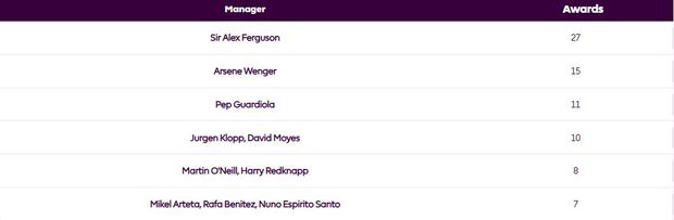 Apenas sete treinadores ganharam o prémio mais vezes do que Nuno Espírito Santo, que se junta a Mikel Arteta e Rafa Benítez no ranking.