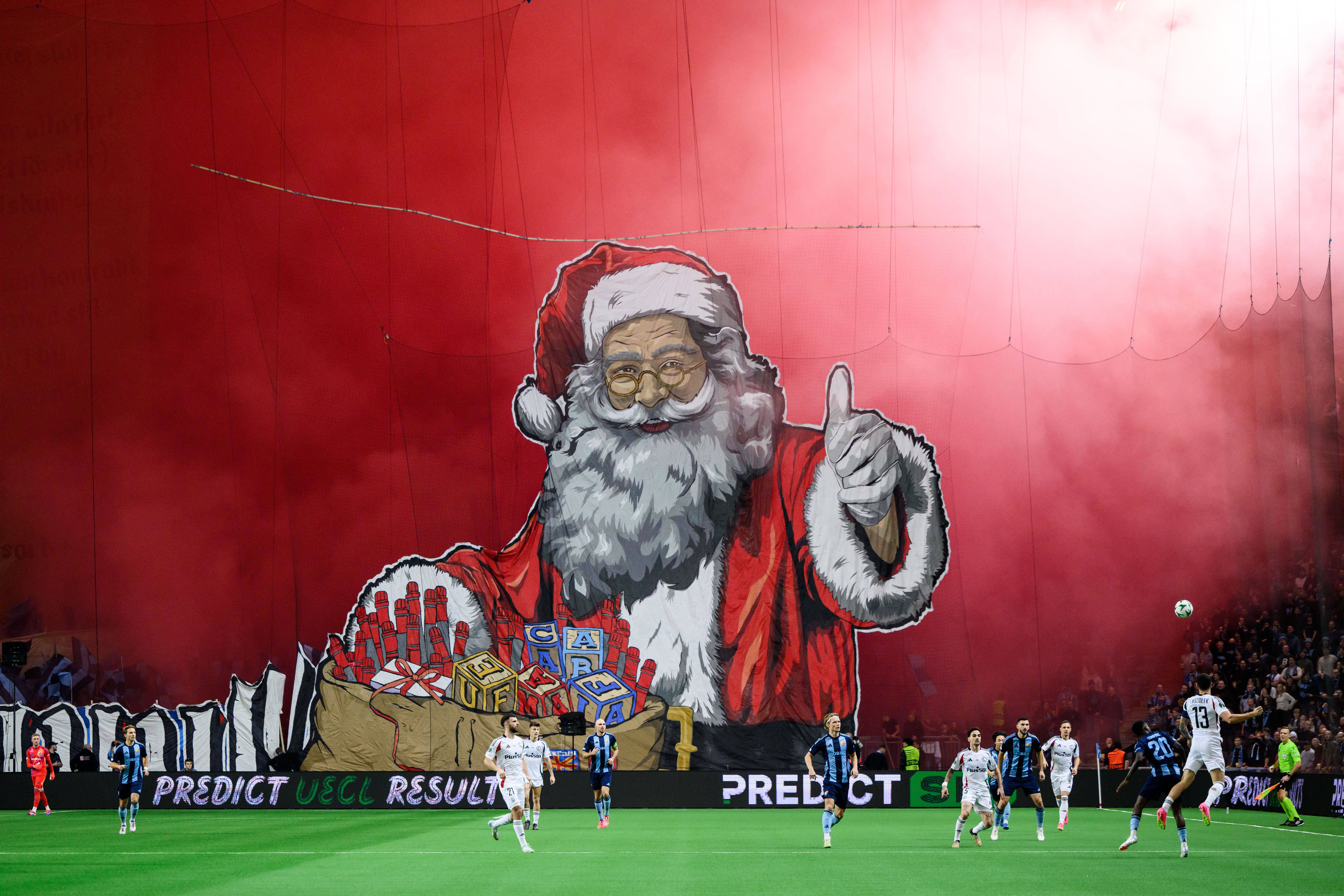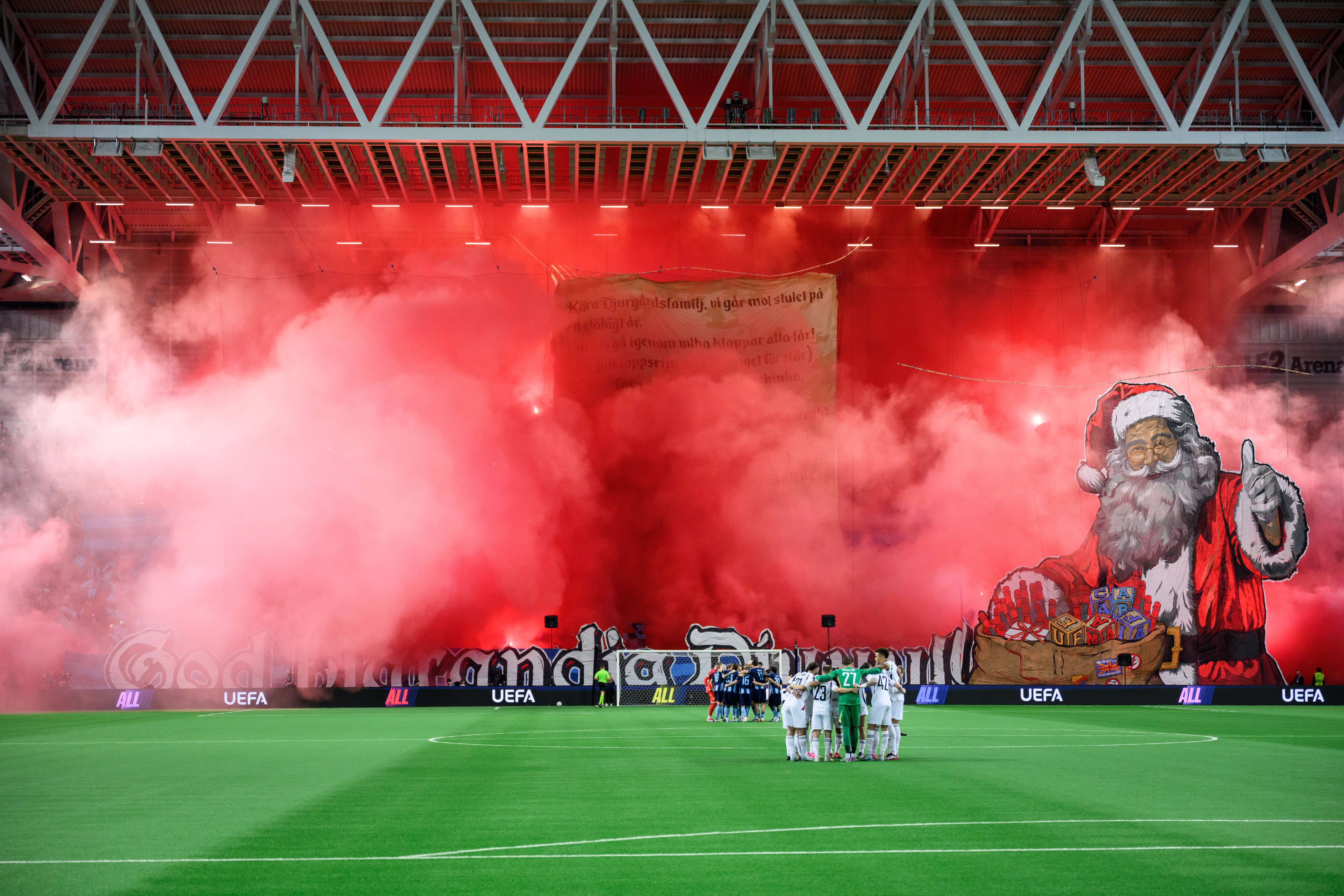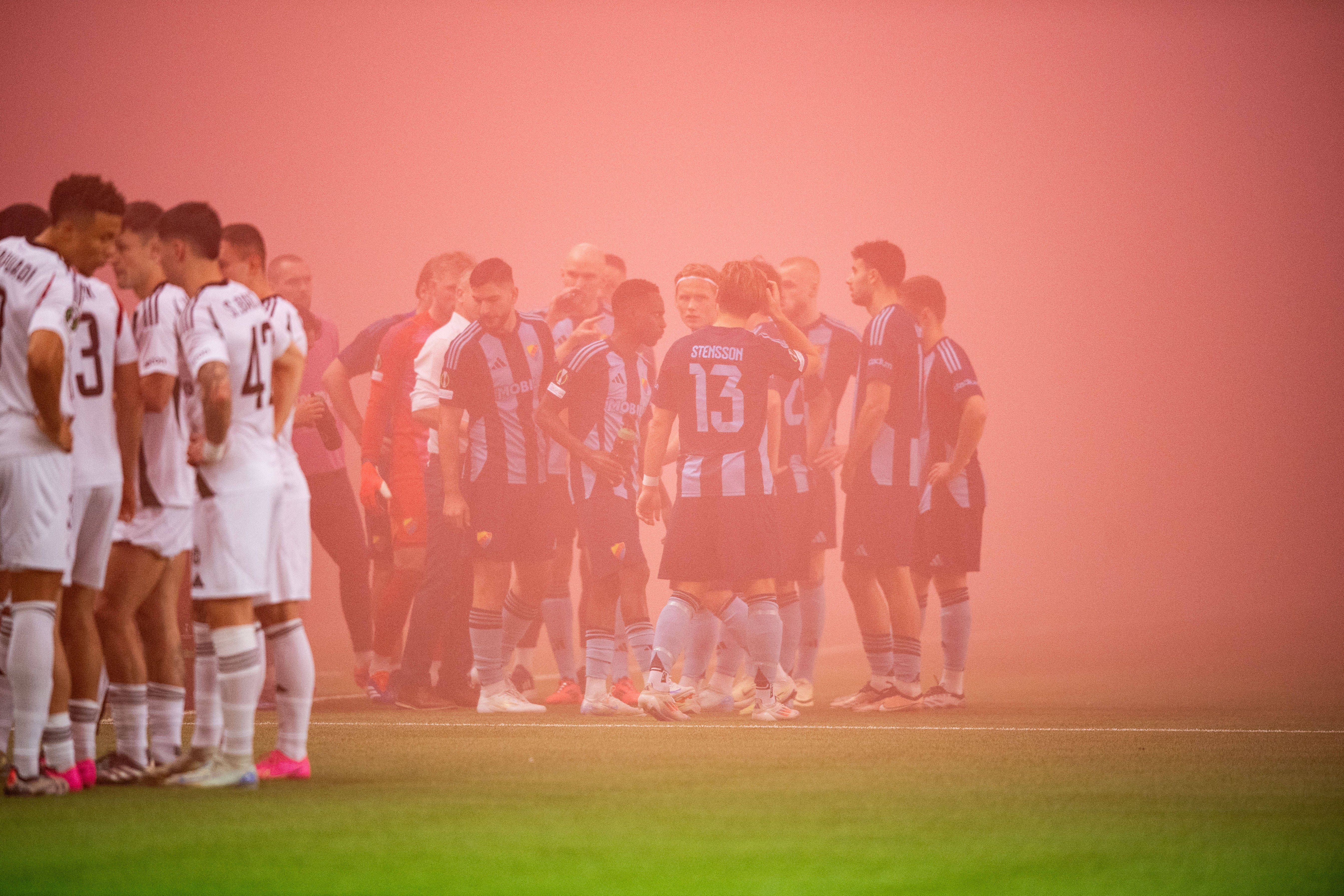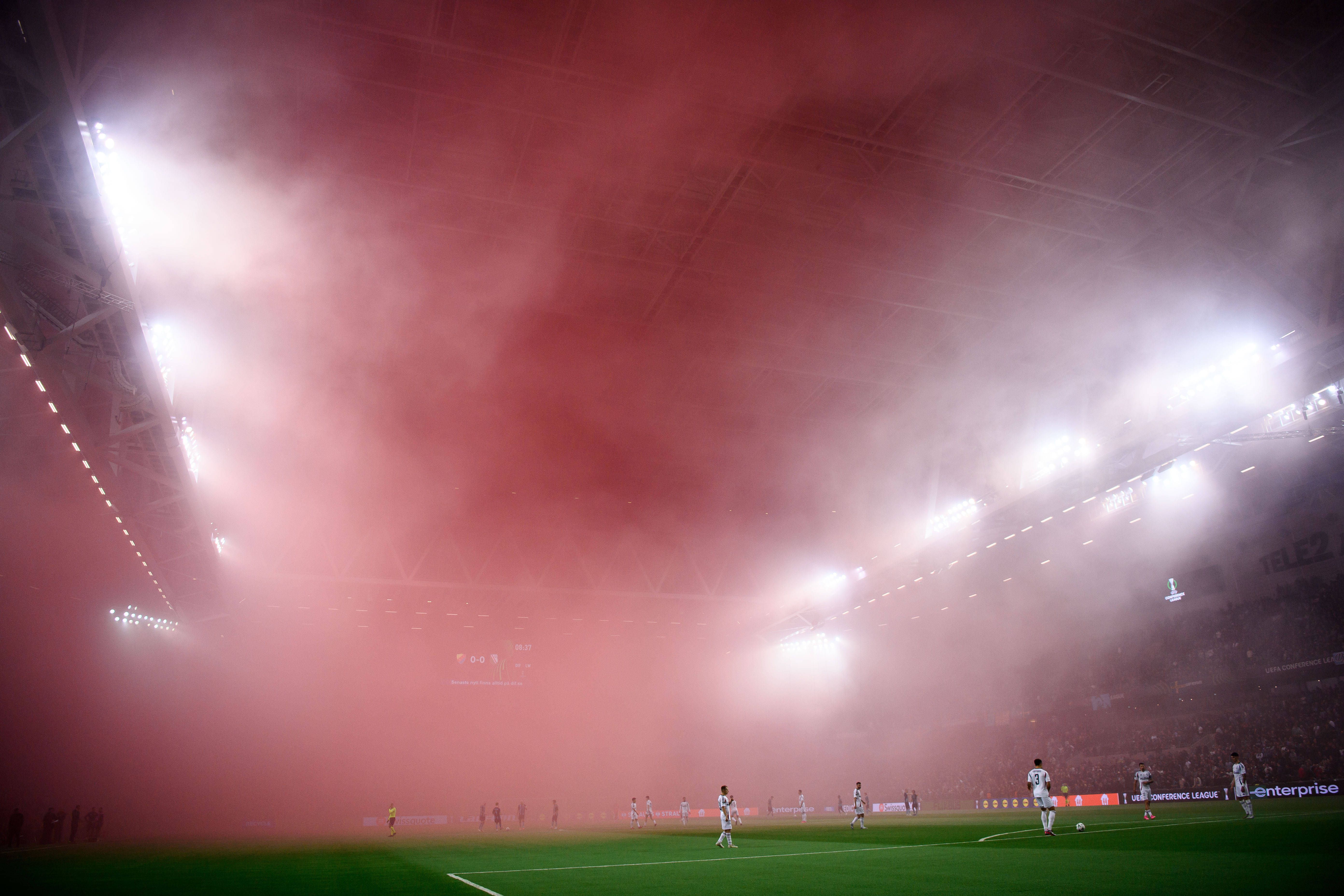 Os adeptos da casa acenderam engenhos pirotécnicos e, com a cobertura do estádio fechada devido ao clima em Estocolmo, ficou a pairar uma grande nuvem de fumo, impossibilitando que o encontro continuasse.