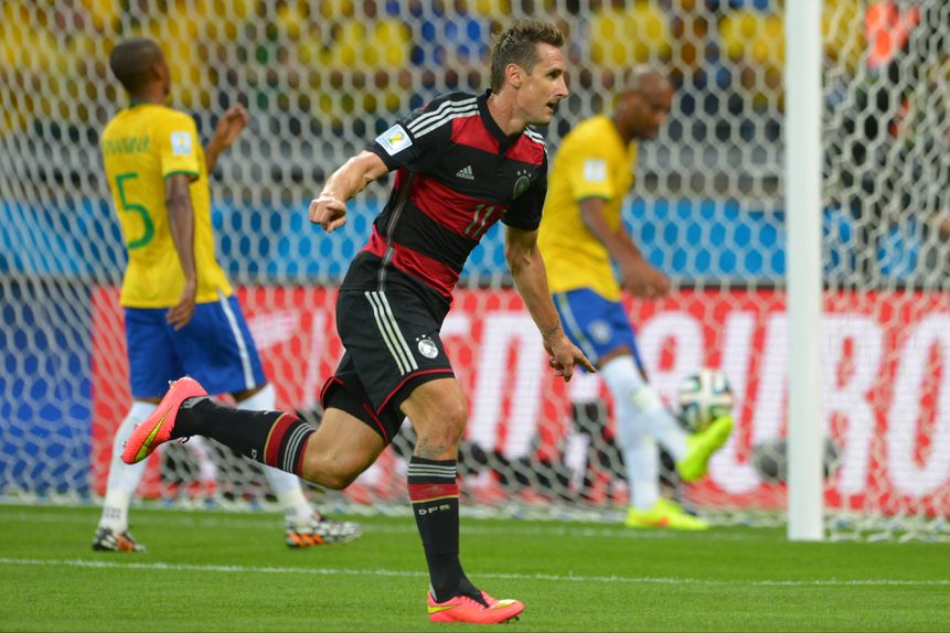 Klose na festa de um dos sete golos da Alemanha ao Brasil, no Mundial-2014 (Foto Imago)