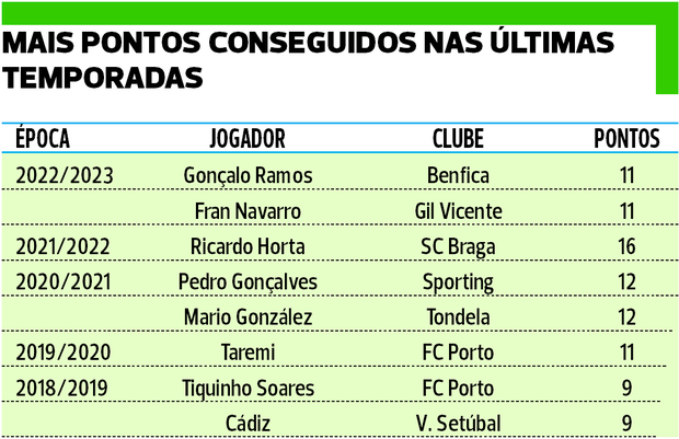 E os números que o camisola 20 dos verdes e brancos apresenta a oito passadas do fim da prova já igualam os 11 pontos que Gonçalo Ramos e Fran Navarro deram, cada qual, a Benfica e Gil Vicente na temporada passada. Números ainda bem distantes da preponderância alcançada pelo neerlandês Bas Dost, goleador de créditos firmados que em 2016/2017 valeu 22 pontos ao Sporting (sendo responsável por nove das 21 vitórias leoninas nesse campeonato!) e 18 na época seguinte.