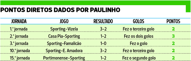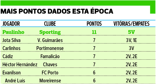 E se todos os golos são igualmente saborosos, uns há mais valiosos que outros, precisamente os que determinam o resultado final e valem pontos. Ora dos 11 golos que o jogador nascido em Barcelos há 31 anos apontou na prova onde conta 22 presenças (só sete vezes titular) - cinco de pé esquerdo, dois com o pé direito e quatro de cabeça - seis foram determinantes para a conquista de pontos por parte da equipa de Rúben Amorim como se pode constatar no quadro à parte. Cinco das 21 vitórias dos leões ficaram a dever-se a remates de Paulinho, que é assim responsável diretamente por 11 pontos dos lideres da Liga, mostrando grande propensão para apontar golos que se revelam valiosos em especial na primeira volta da prova.