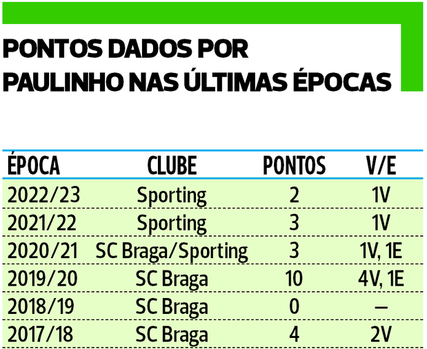 Olhando para as últimas temporadas esta já é mesmo a época mais influente de Paulinho - os seus golos deram apenas e respetivamente três, três e dois pontos aos leões desde que chegou a Alvalade na janela de janeiro de 2021 vindo de Braga - e só em 2019/2020 se aproximou, com os 10 pontos diretos que os guerreiros minhotos conseguiram fruto dos seus remates.