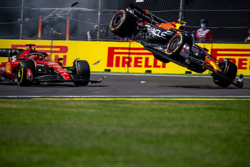 Checo Pérez até arrancou bem, mas um erro logo na primeira curva do circuito fê-lo bater no Ferrari de Charles Leclerc e deixou-lhe o carro demasiado danificado para poder continuar em prova.