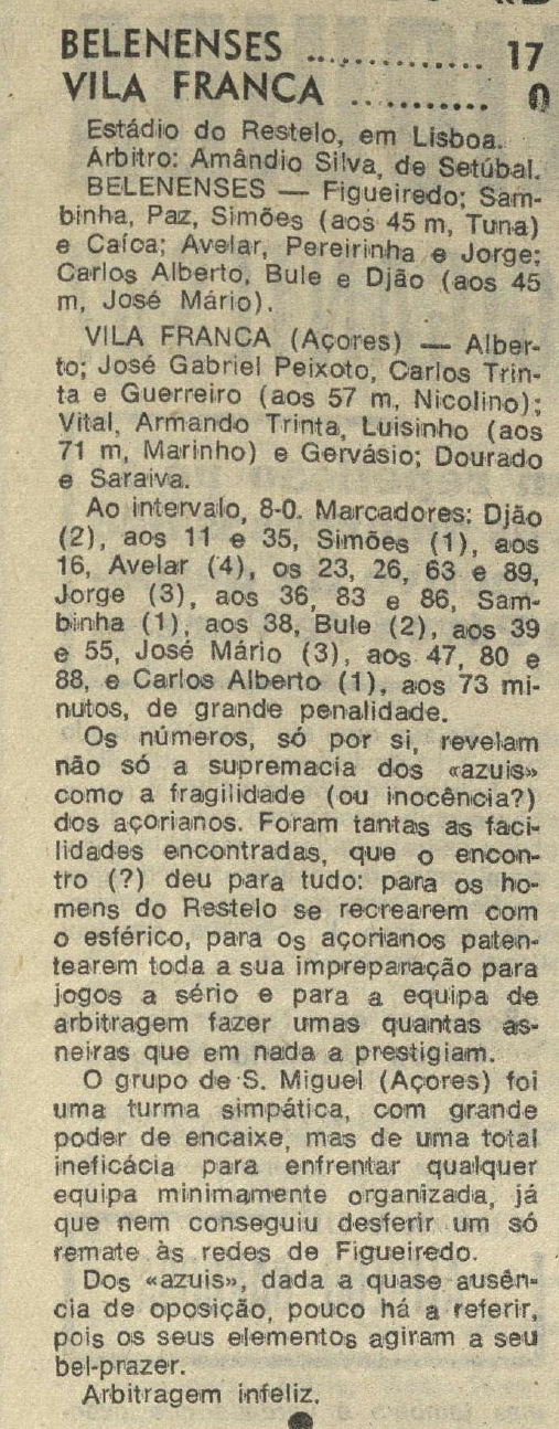 Os números, só por si, revelam não só a supremacia dos «azuis» como a fragilidade (ou inocência?) dos açorianos. Foram tantas as facilidades encontradas, que o encontro (?) deu para tudo: para os homens do Restelo se recrearem com o esférico, para os açorianos patentearem toda a sua impreparação para jogos a sério e para a equipa de arbitragem fazer umas quantas asneiras que em nada a prestigiam. O grupo de S. Miguel (Açores) foi uma turma simpática, com grande poder de encaixe, mas de uma total ineficácia para enfrentar qualquer equipa minimamente organizada, já que nem conseguiu desferir um só remate às redes de Figueiredo. Dos «azuis», dada a quase ausência de oposição, pouco há a referir, pois os seus elementos agiram a seu bel-prazer.