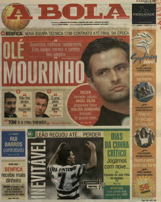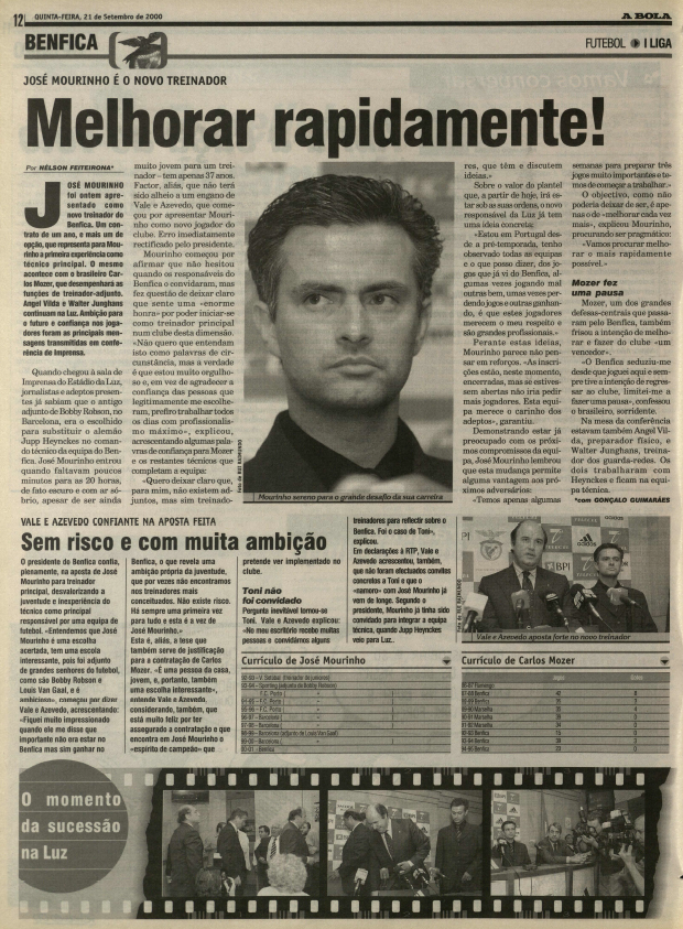 A 20 de setembro de 2000, A BOLA noticiava na sua primeira página: «Saída de Heynckes à vista». Nesse mesmo dia, ao final da tarde, Vale e Azevedo apresentou José Mourinho como novo treinador do Benfica
