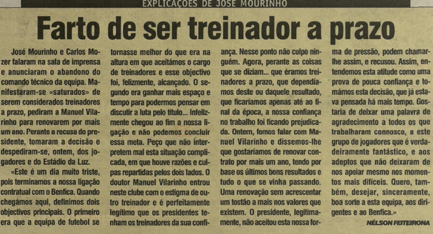 «A Direção do Benfica considerou inaceitável a pressão de Mourinho para que fossem renovados o seu contrato e o de Carlos Mozer [seu adjunto] por mais uma época»