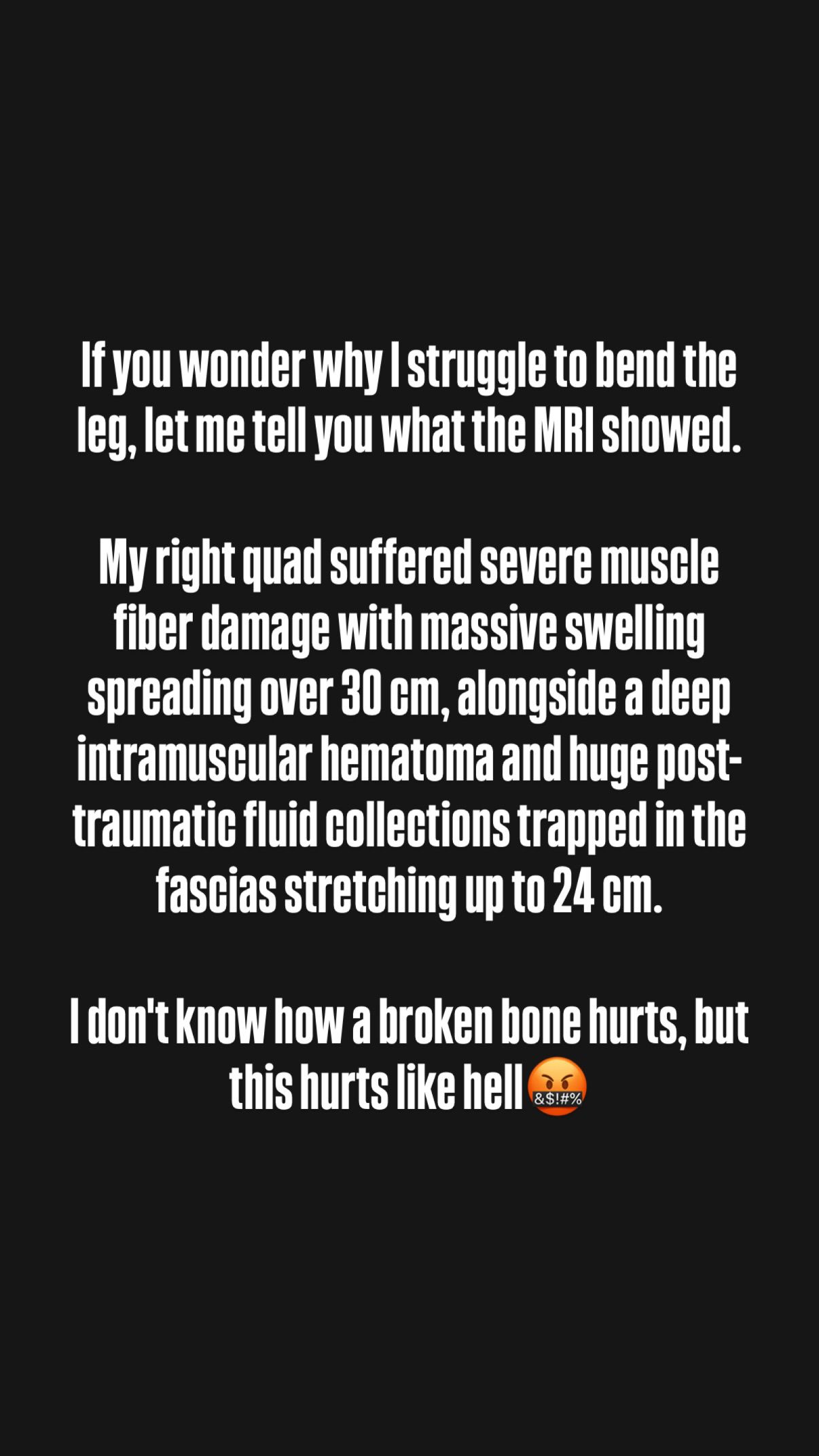 Quatro dias após o incidente, o polaco voltou a usar as redes sociais para atualizar o seu estado, partilhando uma imagem impressionante das lesões. As fotografias mostram o lado direito do seu corpo, desde o ombro até à nádega, coberto de abrasões e hematomas. Kwiatkowski explicou que estava a começar a conseguir usar novamente a perna direita e que a sua recuperação seria feita «um dia de cada vez».