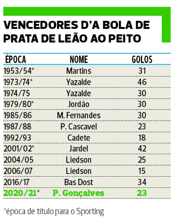 A desta época poderá, assim, ser a sexta BOLA de Prata leonina do século XXI (Jardel ganhou a primeira, em 2001/02), a sexta em 22 anos, depois de nos 49 anteriores ter conquistado sete.