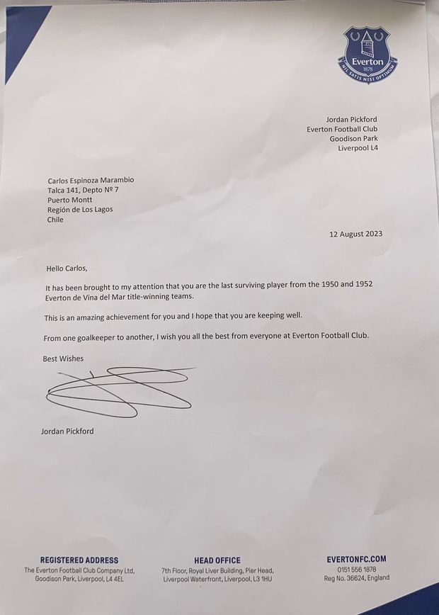 Junto ao equipamento de Pickford seguia a carta de emocionou Carlos Espinoza e que dizia o seguinte: «Fui informado de que você é o último jogador sobrevivente das equipas campeãs do Everton de Viña del Mar em 1950 e 1952. Esta é uma conquista incrível para si e espero que você esteja bem. De um guarda-redes para outro, desejo tudo de melhor para todos do Everton Football Club. Muitas felicidades»