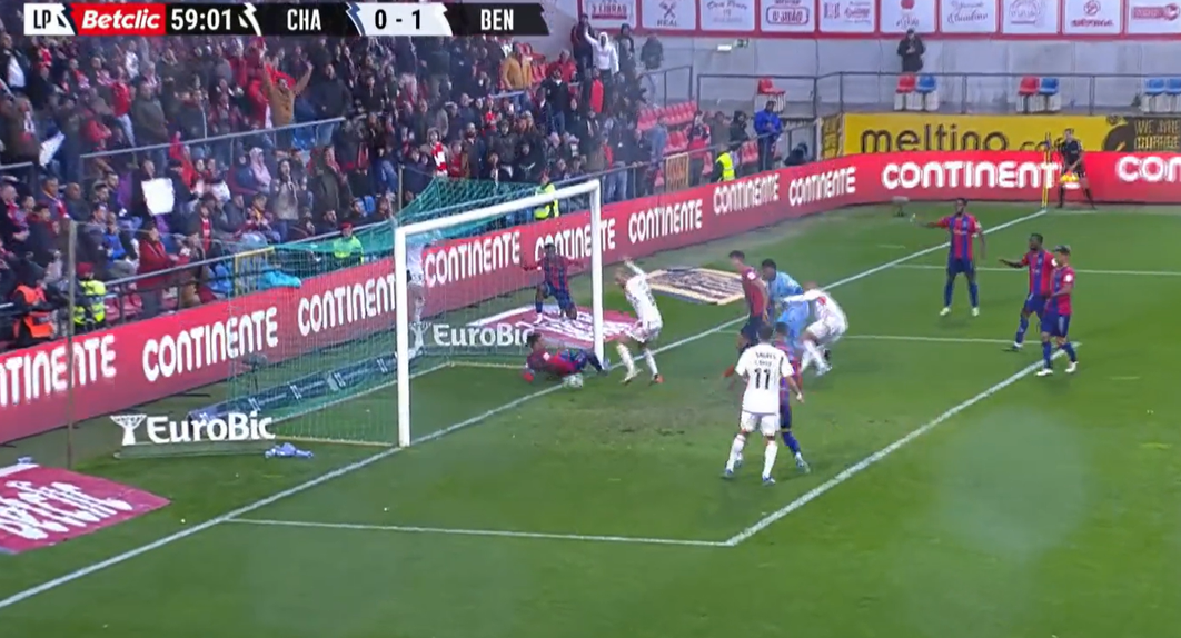 O Benfica inaugurou o marcador em Chaves. João Neves fez a jogada individual, tocou para Arthur Cabral, que viu o remate ser intercetado por João Correia em cima da linha e o norueguês empurrou. Veja o vídeo