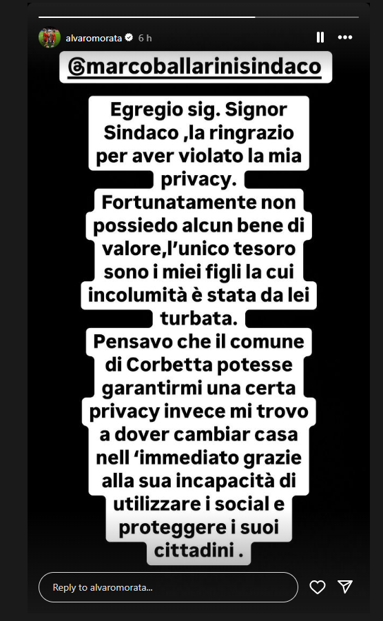 «Caro Presidente da Câmara [Marco Ballarini], obrigado por violar a minha privacidade. Felizmente, não possuo bens valiosos, o único tesouro são os meus filhos, cuja segurança perturbou. Pensava que o município de Corbetta me podia garantir alguma privacidade, mas em vez disso vejo-me obrigado a mudar de casa imediatamente graças à vossa incapacidade de utilizar as redes sociais e proteger os vossos cidadãos», escreveu Morata.