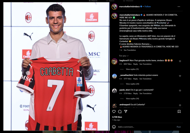 «Álvaro Morata é de Corbetta! Here we go! Não, não é uma brincadeira de 1 de abril. O campeão Álvaro Morata é o nosso novo concidadão de Corbetta! O avançado espanhol, recentemente comprado pelo Milan, está a finalizar a papelada para a mudança oficial para a sua nova (e maravilhosa) casa na nossa cidade. Sabem, sou um grande fã do Inter, mas é com prazer que dou as boas-vindas a Álvaro Morata à nossa grande família em Corbetta», escreveu Marco Ballarini.