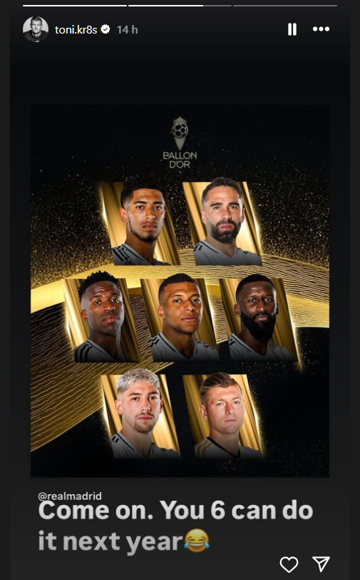 «Vá lá. Vocês os seis podem ganhar no próximo ano», escreveu o antigo médio alemão nas redes sociais, numa brincadeira com Jude Bellingham, Carvajal, Vinícius Jr., Kylian Mbappé, Rudiger e Valverde.