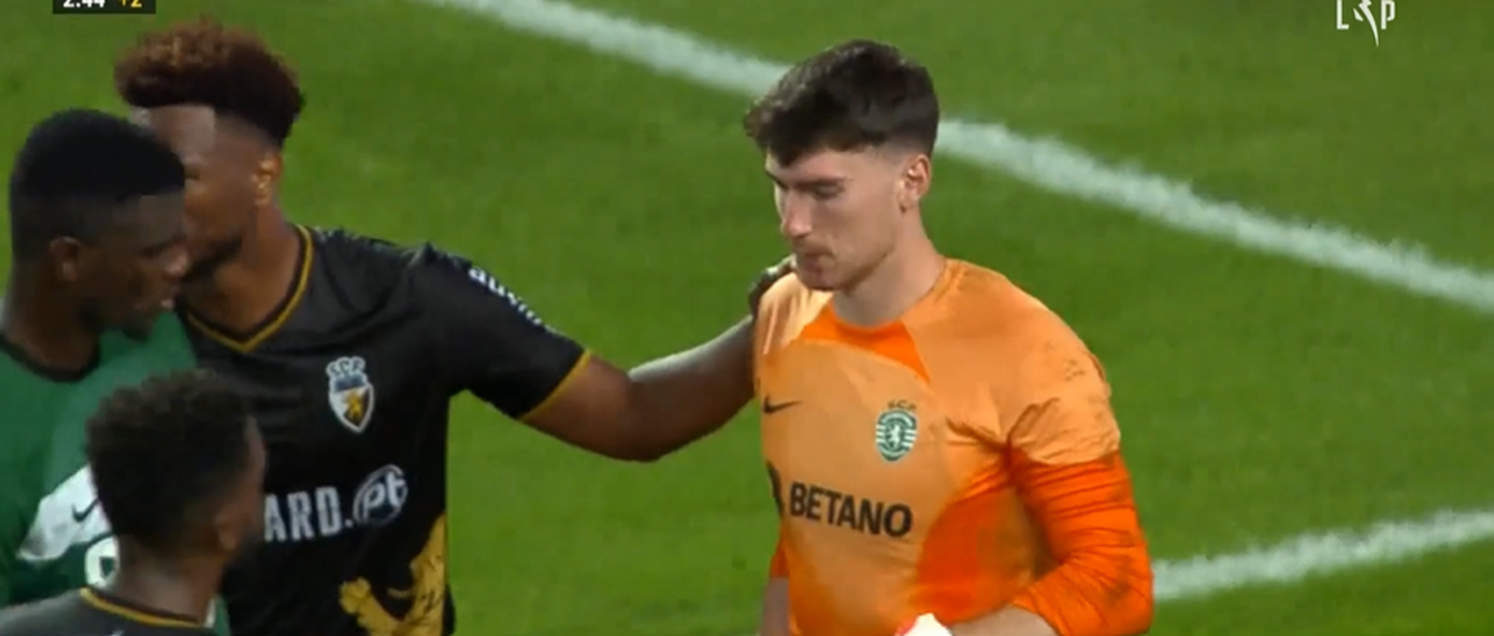 Mesmo em cima do intervalo, o guardião saiu da sua baliza para intercetar bola dirigida a Zé Luís, o jogador do Farense tocou-lhe, mas foi depois o próprio colega Matheus Reis a acertar em cheio com a bota na cara do guarda-redes.