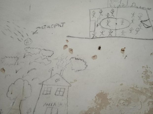 «Fiz os desenhos quando estava no abrigo. Encontrei um pedaço de carvão que era usado pelos russos para escrever nas paredes o nome das pessoas ucranianas que eles mataram. Muitos ucranianos foram mortos na nossa vila, a maioria homens. Encontrei o carvão e comecei a pintar para não pensar nas pessoas que tinham morrido», lembra. A mãe mostra-nos a foto e o vídeo do abrigo já depois da chegada das tropas ucranianas, já com a eletricidade restituída. Mas tal não havia nesses dias de terror num espaço exíguo onde viveram 40 pessoas.
