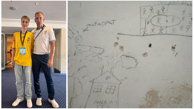 Pedimos-lhe então para voltar atrás e explicar a origem de uns rabiscos que tornaram famosos e cujo significado tocou fundo na comitiva ucraniana. Durante o tempo em que esteve no abrigo subterrâneo, durante a fase de bombardeamentos, a única forma de se distrair era através dos desenhos que fazia nas paredes. Um deles foi de um jogo de futebol imaginário, feito com material outrora usado para gravar o horror.