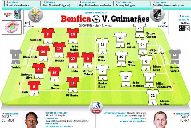 Os onzes prováveis de Benfica e Vitória de Guimarães para o jogo da quarta jornada da Liga, com início marcado para as 20.30 horas deste sábado.