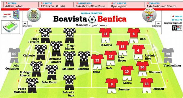 Os onzes prováveis de Boavista e Benfica, equipas que esta segunda-feira se defrontam, a partir das 20.45 horas, no Estádio do Bessa, em partida da jornada inaugural da Liga.