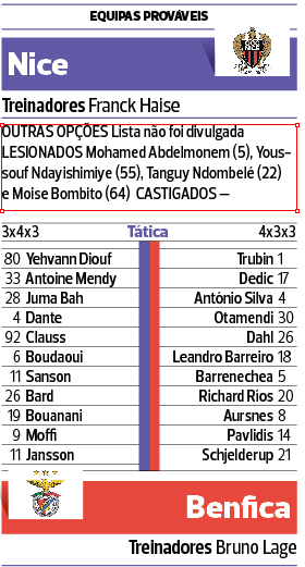O Benfica partiu para França, pois, com o desejo de deixar já tudo bem encaminhado na primeira mão da terceira pré-eliminatória da Champions e, por isso, o treinador entrará com a melhor equipa disponível. Não haverá, como tal, muitas mudanças no onze inicial da Supertaça — uma alteração será forçada, até porque o avançado Kerem Akturkoglu está lesionado e não viajou com a equipa.